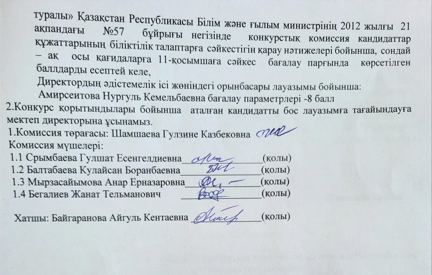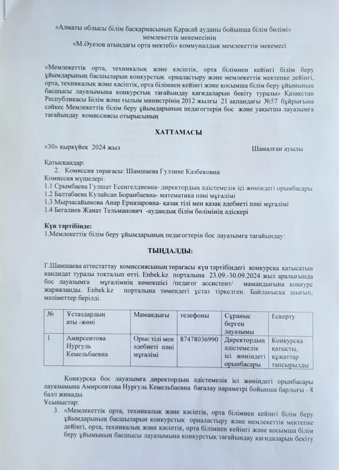 01 қазан 2024 0 1 2 3 4 5 Педагогтердің бос және уақытша лауазымға тағайындау комиссиясы отырысының хаттамасы