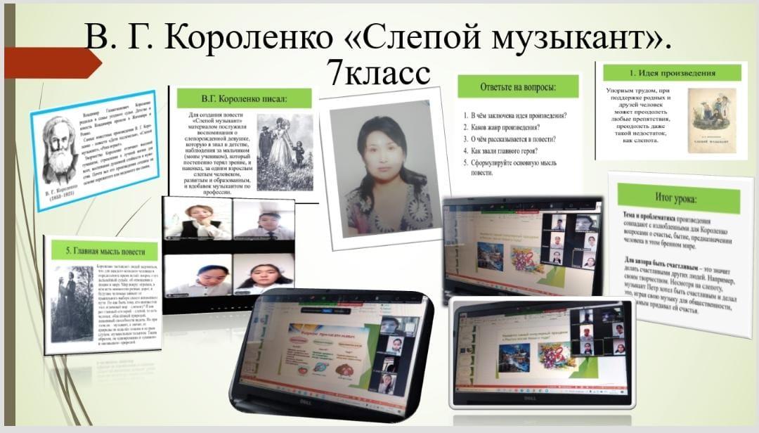 21-қантар күні орыс тілі мен әдебиеті пәні мұғалімі Иматаева Гулмира Муфтуллаевна 7 сыныпта В. Г. Короленко «Слепой музыкант» тақырыбында ЗУМ платформасы арқылы ашық сабақты өткізді.