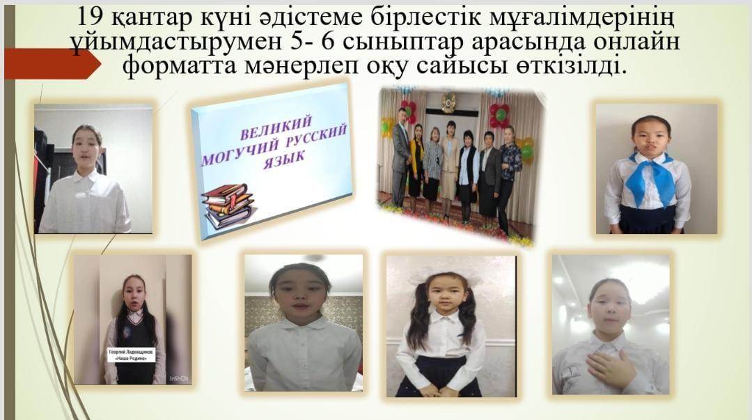 19 қантар күні әдістеме бірлестік мұғалімдерінің ұйымдастырумен 5- 6 сыныптар арасында онлайн форматта мәнерлеп оқу сайысы өткізілді. Сайыс барысында оқушылар өз өнерлерін көрсете білді. Ең үздік оқырмандар мақтау қағаздарымен марапатталды. ІІІ орын 5ә сынып оқушысы Курманалиева Аружан, ІІ орын 5а сынып оқушысы Ізбасар Арман және І орынды Каллибеков Акылбек жеңіп алды.
