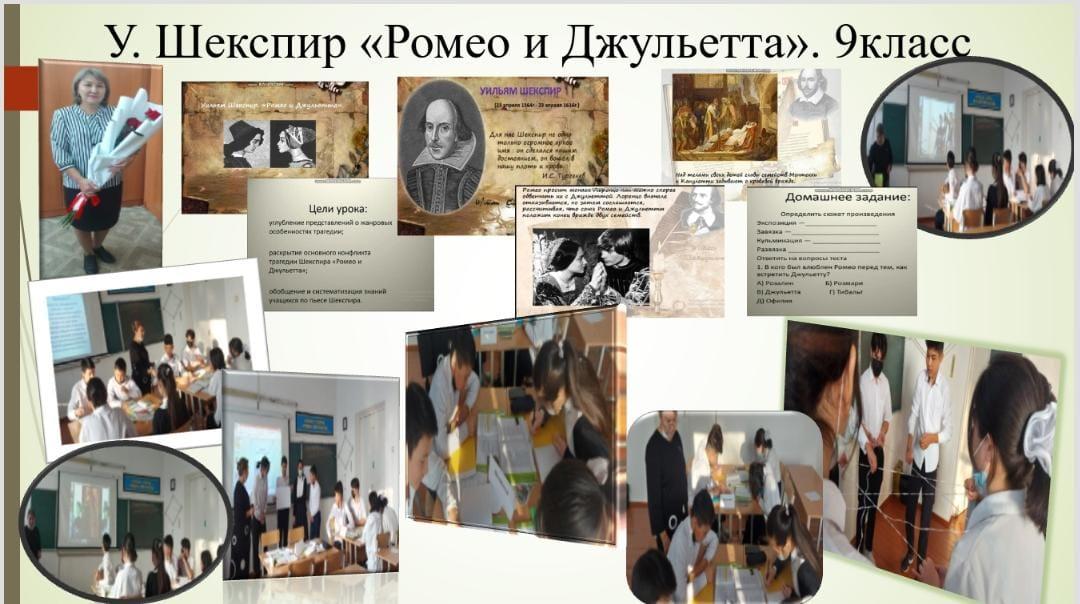 26- қантар күні 9 сыныпта Джаксыбаева Венера Тулегеновна «Уильям Шекспир " Ромео и Джульетта"» тақырыбында ашық сабақ өткізді. Сабаққа психологиялық ахуал қалыптастыру мақсатында "Өрмекші" әдісі, жаңа сабақты болжау мақсатында "Төрт сурет, бір сөз" әдісі қолданылды. Сабақ барысында әртүрлі деңгейлік тапсырмаларды орындау кезінде "Мені суретте", "Мен зерттеушімін", "Пошта" атты әдістер өте тиімді қолданылды. Сабақ соңында "Жүректен жүрекке" әдісі арқылы рефлексия орындалды. Сабақ өз мақсатына жетті.