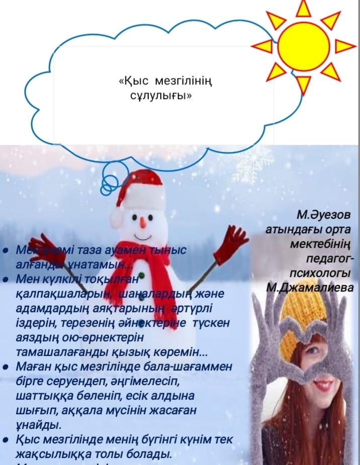 8.02.2022ж күні М.Әуезов атындағы орта мектебінің педагог-психологы М.Джамалиеваның "Қыс мезгілінің сұлулығы" атты аффирмациясы.