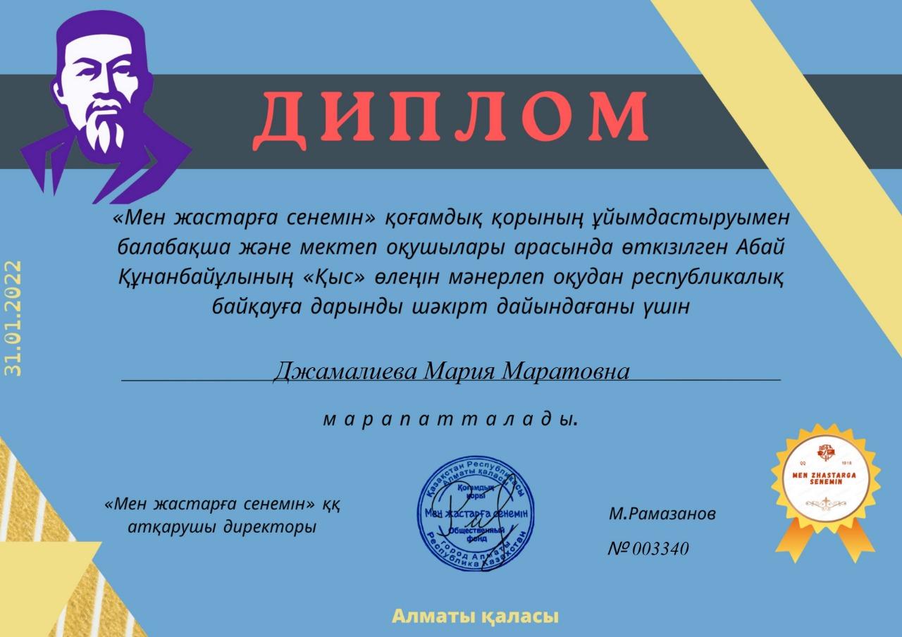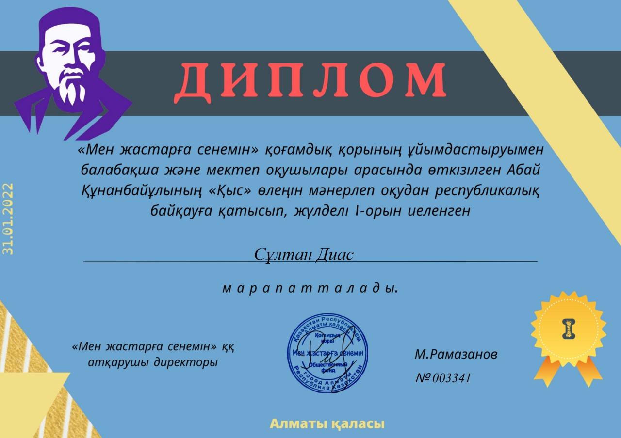 Өзін-өзі тану пәнінен 2 "Б" сынып оқушысы Сұлтан Диас BILIMTIME.KZ орталығының республикалық олимпиаданың, "Мен жастарға сенемін" қоғамдық қорының республикалық  байқауына қатысып, І-дәрежелі Дипломдарды иеленді. Жетекшісі М. Джамалиева дипломдармен марапатталды.