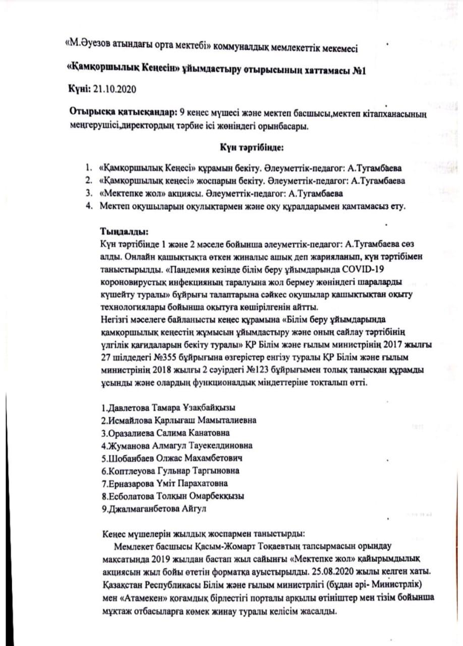 21 қазан 2020 0 1 2 3 4 5 "М.Әуезов атындағы орта мектебі"коммуналдық мемлекеттік мекемесінің Қамқоршылық кеңес ұйымдастыру отырысының хаттамасы №1