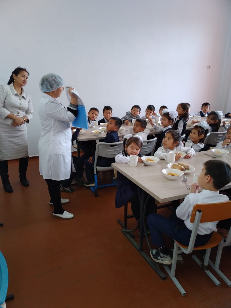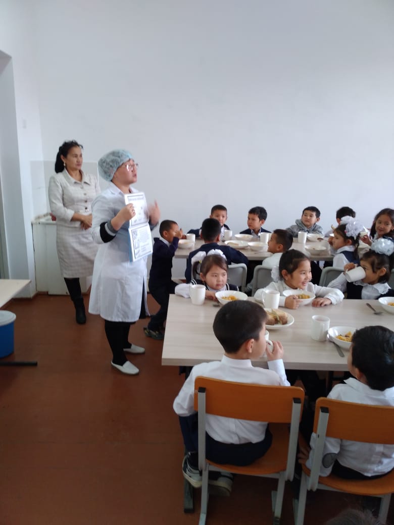 "М. Әуезов атындағы орта мектебі" КММ.  2023 жылдың желтоқсан айында, мектеп медбикесі А. Акимжанова мен әлеуметтік педогог А. Тенизбаева 1-4 сынып оқушыларына дұрыс тамақтану әдебі мен жедел ішек инфекциясының алдын алуы туралы түсіндірме жұмыстар жүргізді.