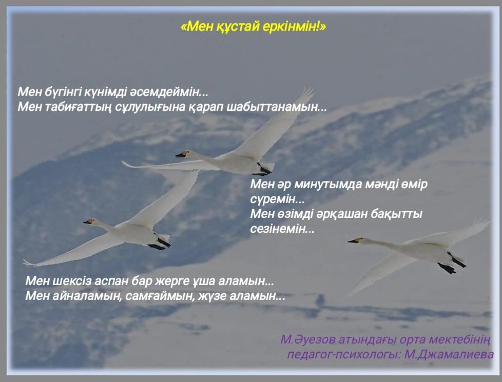 15 ақпан 2022 0 1 2 3 4 5 "Зорлық-зомбылықсыз балалық шақ" облыстық онлайн марафоны жалғасуда. 15.02.2022ж күні М.Әуезов атындағы орта мектебінің педагог-психологы М.Джамалиеваның "Мен құстай еркінмін!" тақырыбындағы аффимациясы.