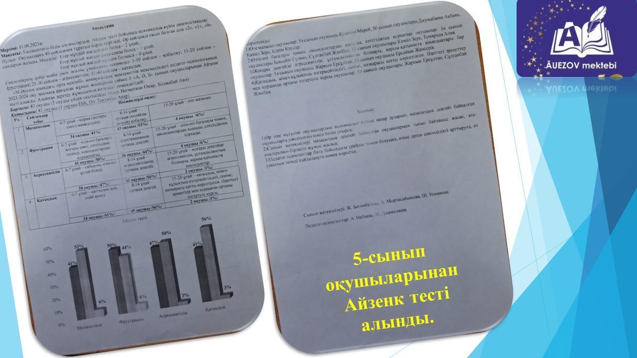 11 қыркүйек 2023 0 1 2 3 4 5 Айзенк тесті алынды 2023 жылдың 11 қыркүйек күні М. Әуезов атындағы орта мектебінің педагог-психологтары 2023-2024 оқу жылына арналған жұмыс жоспарына сәйкес 5 "А, Ә, Б" сынып оқушыларынан Айзенк тесті алынды.