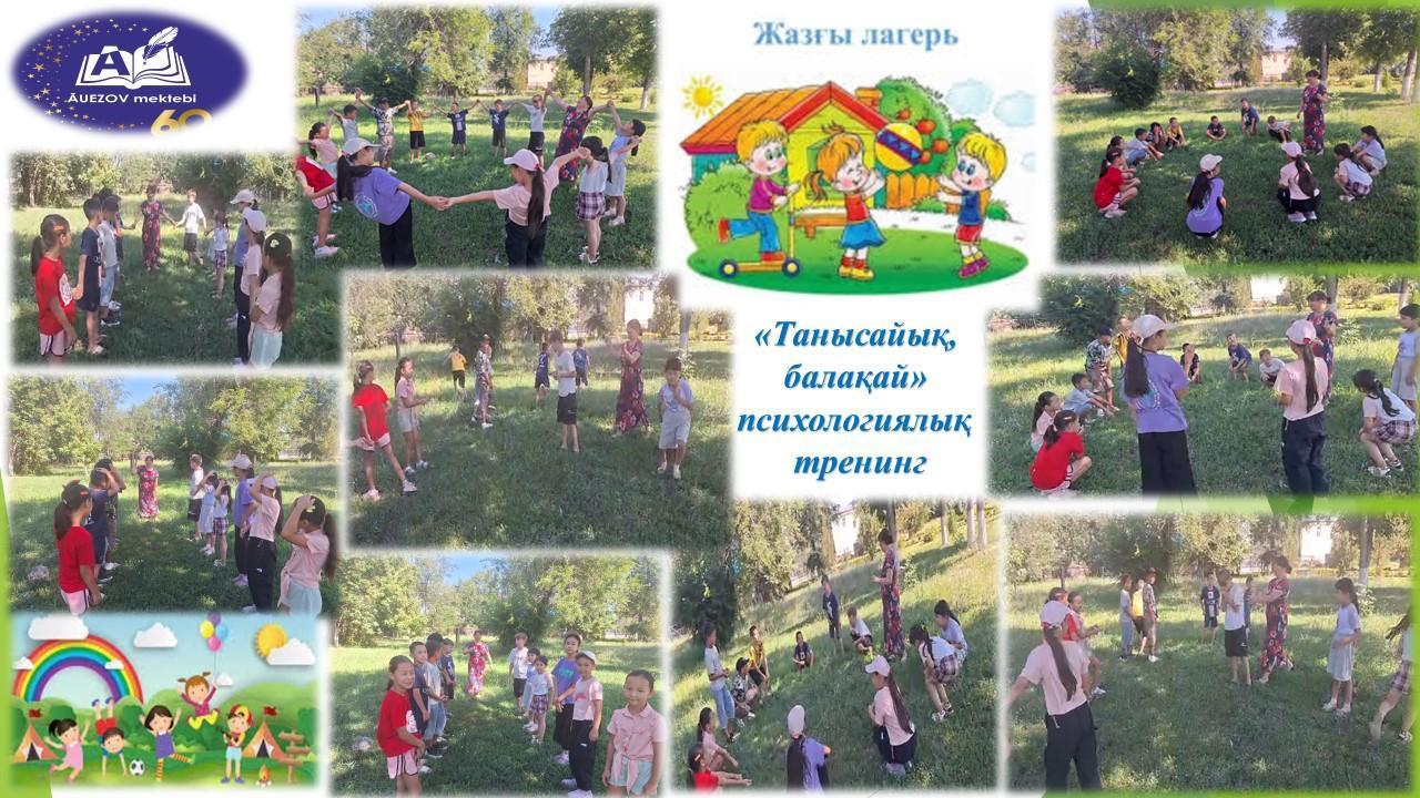 2024 жылдың 25 шілде күнінде «М. Әуезов атындағы орта мектеп» базасындағы «Айгөлек» демалыс тынығу алаңының IV-кезеңінде педагог-психолог М. Джамалиева балалармен «Танысайық, балақай!» тақырыбында психологиялық ойын-жаттығуларын ұйымдастырды. Мақсаты: Балалардың жас ерекшеліктерін ескере отырып, дамытушылық ойындар арқылы логикалық қабілетін дамуына, интеллектуалдық деңгейін көтеруіне ықпал жасау. Жұмыс барысында тәрбиеленушілердің логикалық ойлары дамып, көңіл күйлері көтерілді.