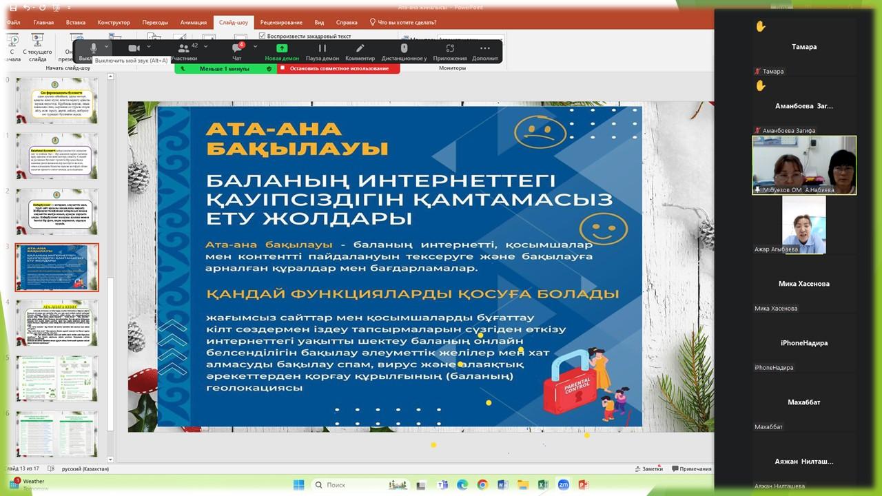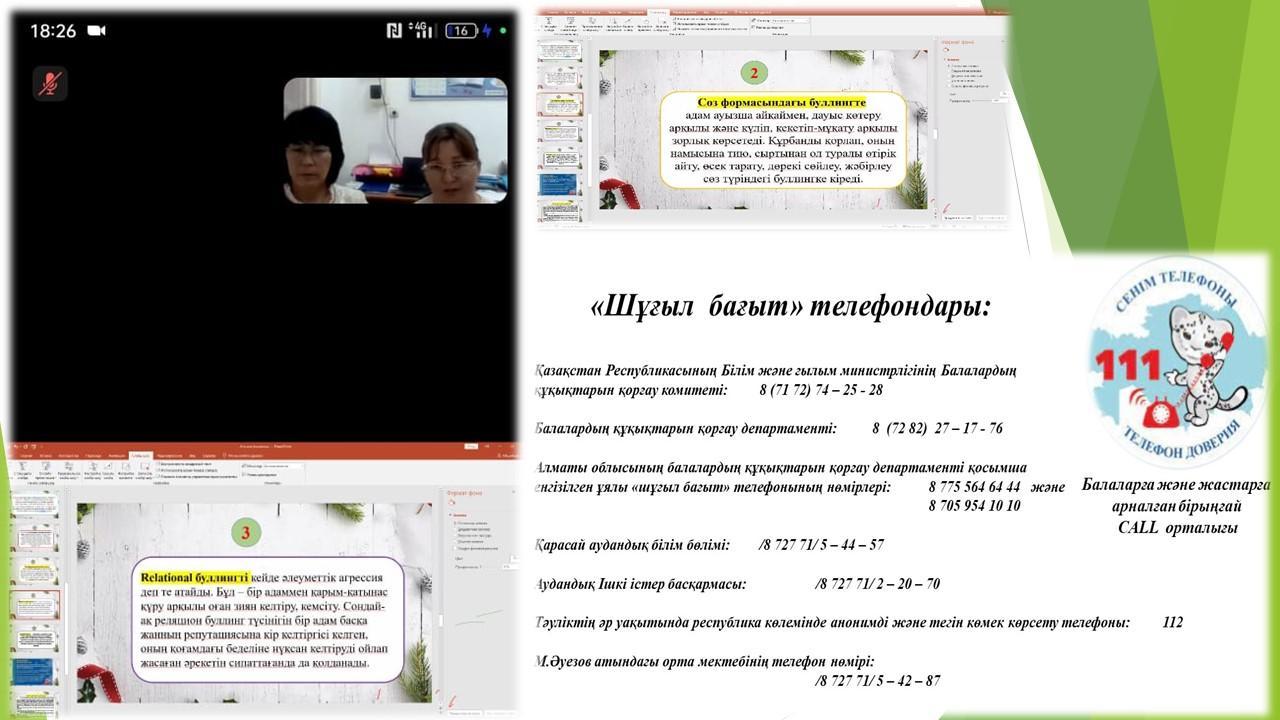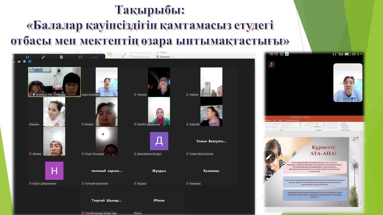 М.Әуезов атындағы орта мектебінде балалар арасындағы буллинг, кибербуллинг, өзіне-өзі қол жұмсаудың алдын алу мақсатында «Балалар қауіпсіздігін қамтамасыз етудегі отбасы мен мектептің өзара ынтымақтастығы» тақырыбында жалпы ата-аналармен вебинар өтті