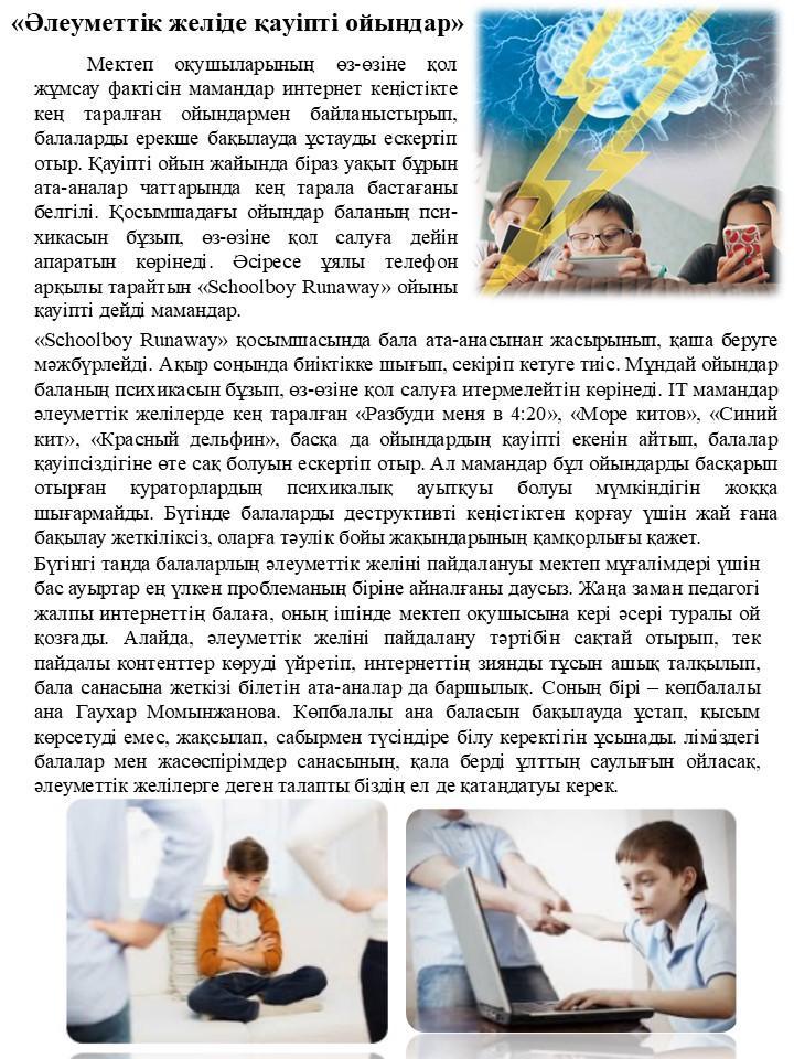 2024 жылдың 7-13 қазан күндері аралығында педагог-психологтің 2024-2025 оқу жылына арналған жұмыс жоспарына сәйкес А. Набиева мен М. Джамалиева әлеуметтік желіден тарайтын келеңсіз ойындардың алдын алу мақсатында 1-11 сынып оқушыларының ата-аналарына арналған «Әлеуметтік желіде қауіпті ойындар» тақырыбында дәріс оқып, ақпараттық-түсіндіру жұмыстарын жүргізді.