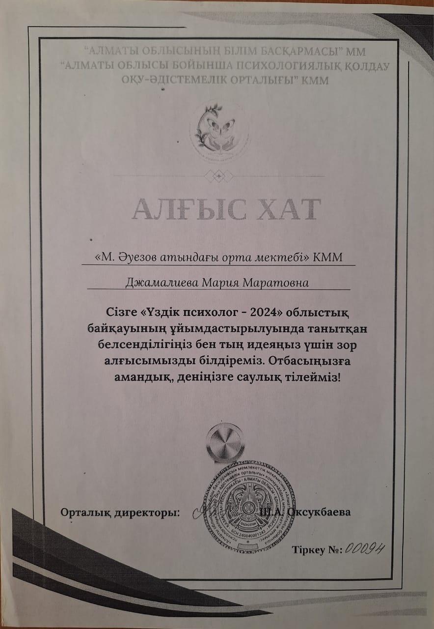 2024 жылдың 19 қараша күні Долан жайлы мектеп базасында «Алматы облысы білім басқармасы» ММ «Алматы облысы бойынша психологиялық қолдау оқу-әдістемелік орталығы» КММ «Үздік психолог-2024» облыстық байқауының ұйымдастырылуында танытқан белсенділігіңіз бен тың идеяңыз үшін М. Әуезов атындағы орта мектебінің педагог-психологі Джамалиева Мария Маратовнаға Алғыс хат берілді.