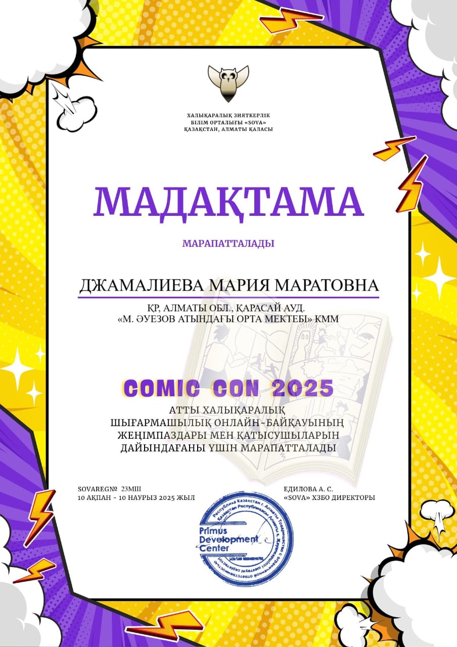 «COMIC CON 2025» атты шығармашылық онлайн-байқауының жеңімпазы атанды. » Мұхтар Әуезов атындағы орта мектеп