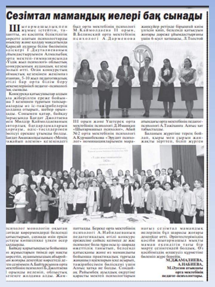 24 маусым 2024 0 1 2 3 4 5 Сезімтал мамандық иелері бақ сынады 2024 жылдың 24 мамыр күні «NAQTY» Қарасай аудандық апталық, қоғамдық-саяси газетінің №21 (8607) санындағы басылымында М. Әуезов атындағы орта мектебінің педагог-психоогтері А. Набиева мен М. Джамалиеваның бірігіп жазған мақаласы жарияланды.