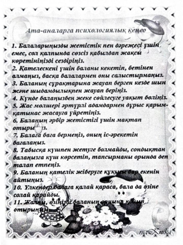 2024 жылдың 2-13 қыркүйек күндері аралығында педагог-психологтің 2024-2025 оқу жылына арналған жұмыс жоспарына сәйкес А. Набиева мен М. Джамалиева 1-11 сынып оқушыларының ата-аналарына арналған «Өз балаңа үлгі бол!» тақырыбында жадынамалар таратты. Родителям төмендегідей үлгіде (және тағы да басқадай үлгіде) кеңестер берілді.