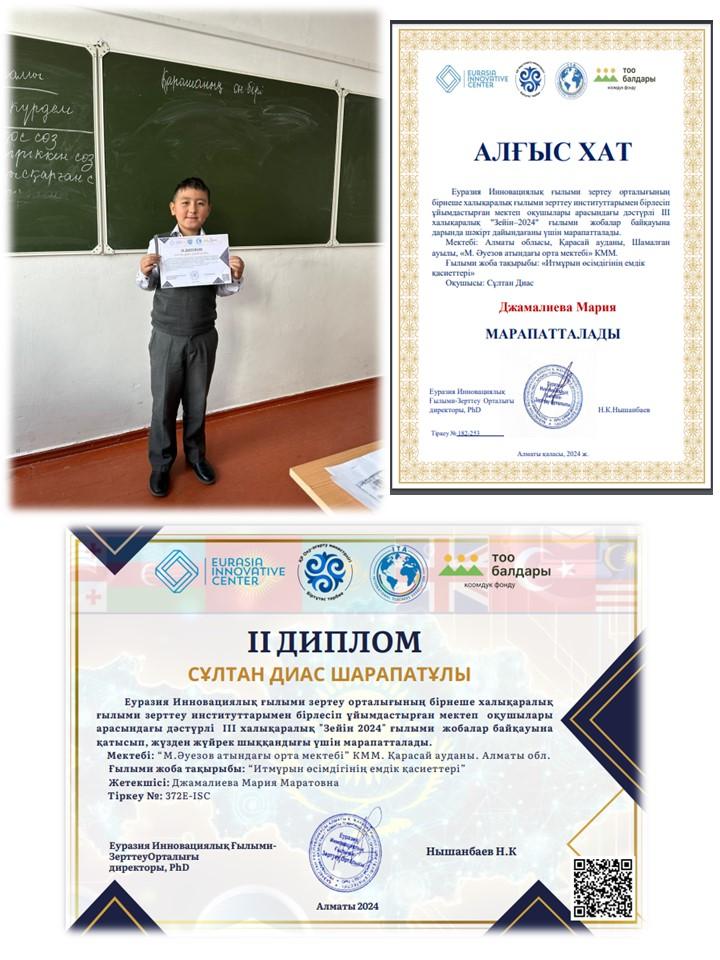 2024 жылдың қазан айында Еуразия Инновациялық ғылыми зерттеу орталығының бірнеше халықаралық ғылыми зерттеу институттарымен бірлесіп ұйымдастырған мектеп оқушылары арасында дәстүрлі ІІІ халықаралық «Зейін-2024» ғылыми жобалар байқауына М. Әуезов атындағы орта мектебінің 5 "Б" сынып оқушысы Сұлтан Диас қатысып, ІІ-орын иегері атанды. Жетекшісі педагог-психолог Джамалиева Мария Маратовнаға алғыс хат берілді.