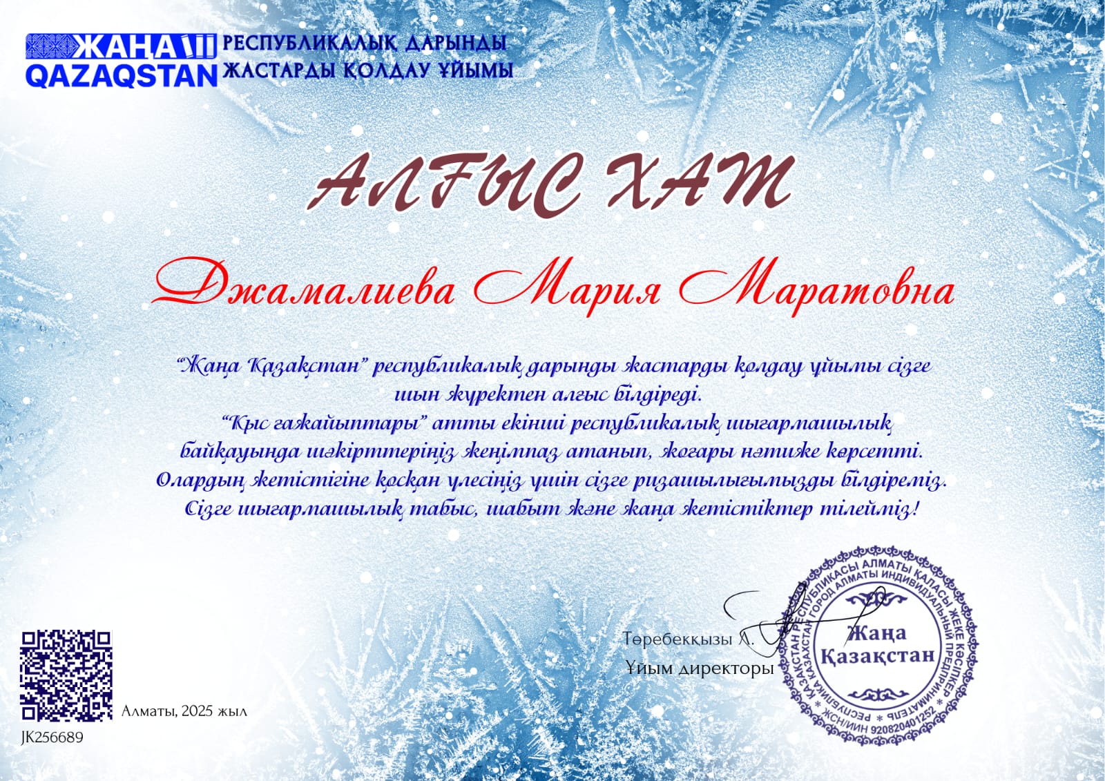 2025 жылдың 24 ақпан күні "Жаңа Қазақстан" республикалық дарынды жастарды қолдау ұйымының ұйымдастыруымен 2025 жылғы қаңтар айында балабақша тәрбиеленушілері, мектепалды двярлық сыныптары және мектеп оқушылары арасында өткізілген ІІ республикалық "Қыс ғажайыптары" атты байқауына сурет және қолөнер номинациясы бойынша М. Әуезов атындағы орта мектебінің 1 "Б" сынып оқушысы Ермаханова Мөлдір қатысып, І-орынды иеленді. Жетекшісі педагог-психолог М. Джамалиеваға ұйымның атынан Алғыс хат берілді.